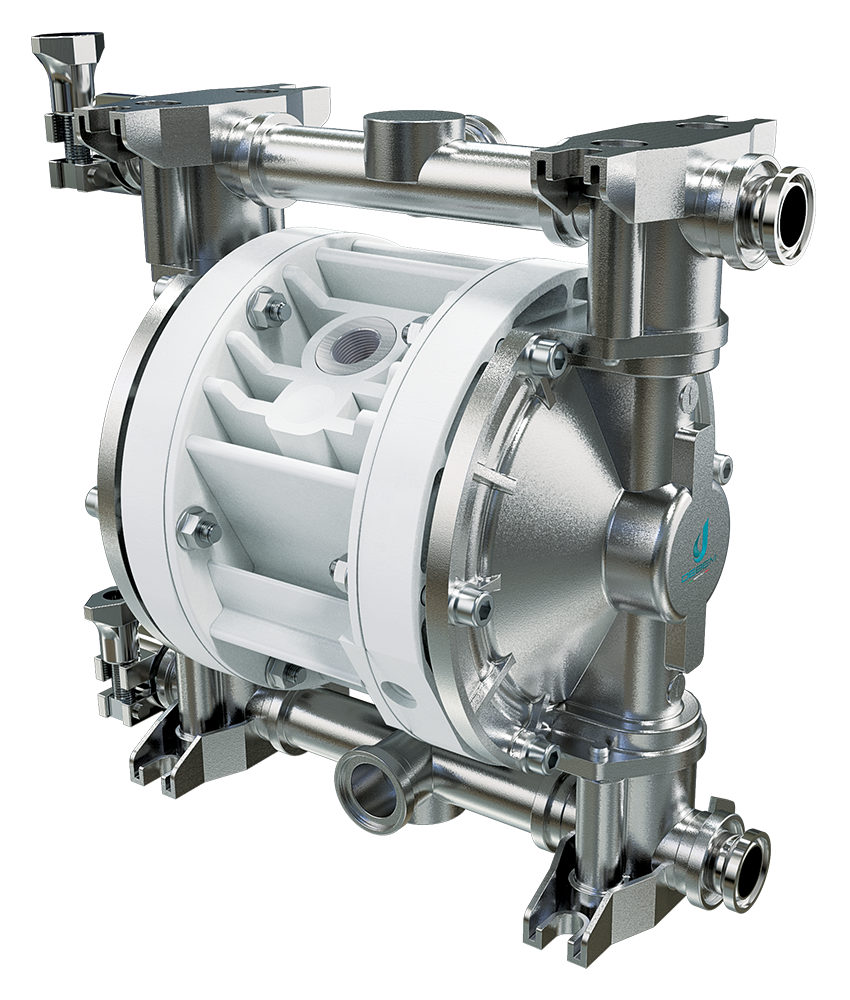 Zasada działania pomp AODD opiera się na pneumatycznym wymienniku zasilanym powietrzem, który kieruje sprężone powietrze za jedną z dwóch membran. Membrana, wykonując swój suw, wypycha produkt do kolektora tłocznego. W tym samym czasie druga membrana, połączona z pierwszą za pomocą wału, wytwarza podciśnienie w kolektorze ssącym, zasysając produkt. Po zakończeniu suwu, wymiennik pneumatyczny kieruje sprężone powietrze za drugą membranę, rozpoczynając cykl od nowa.